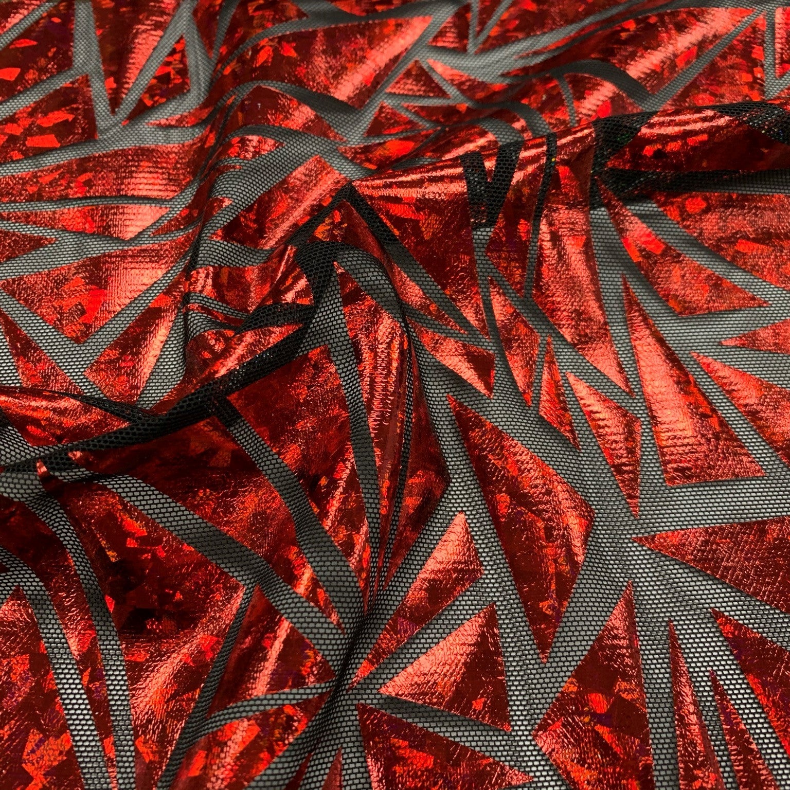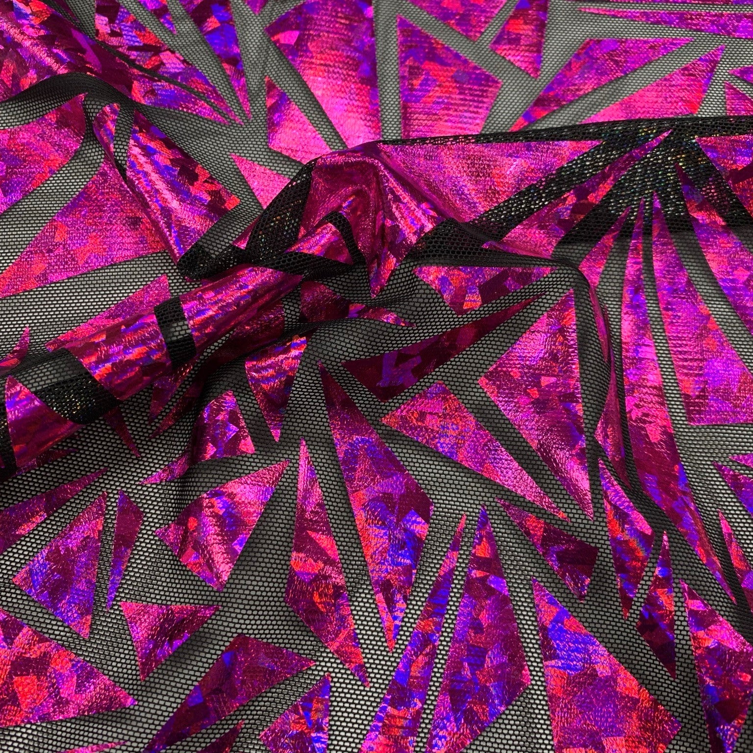 Abstract Triangle is a 4-way stretch Polyester Mesh with shattered glass foil. This fabric is excellent for dancewear and performance costumes. It's lightweight and breathable, making it perfect for dancewear that needs to have maximum movement and flexibility. It's easy to care for and offers bold, eye-catching details that will take any performance costume to the next level. This fabric is durable and long-lasting, so you can trust that your performance costume will stand up to the rigors of both practice and performance.