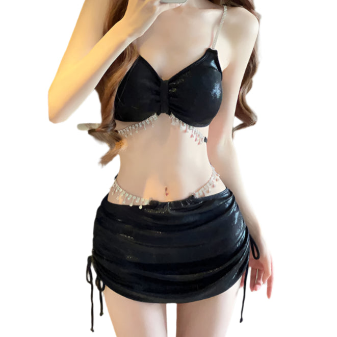 Turn every pool party into a red carpet moment. This shimmering black two-piece set features a dazzling rhinestone fringe trim and ruched micro skirt with adjustable sides for the perfect fit. The metallic finish catches every flicker of light, while the chain straps add an extra touch of drama.