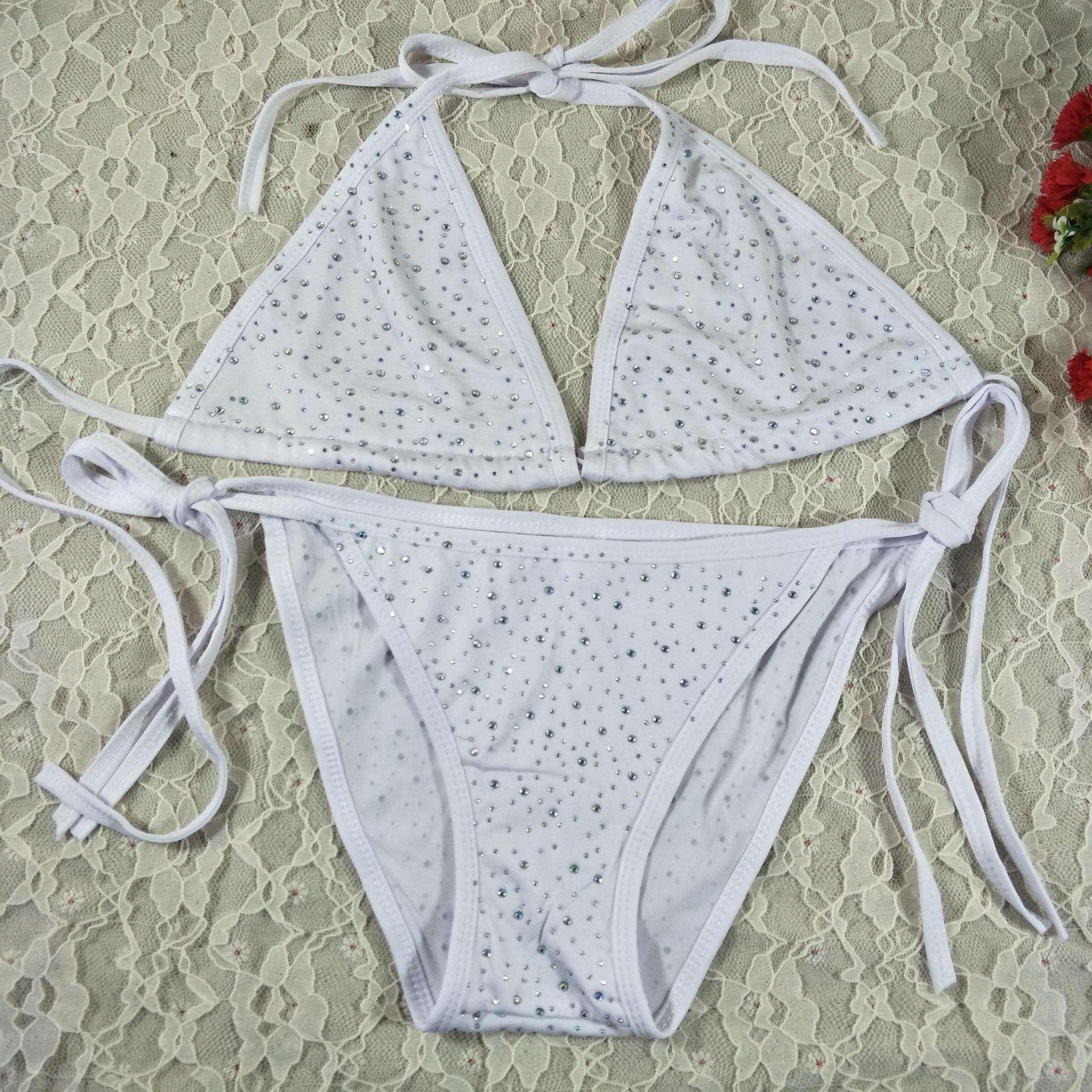 Make waves and steal spotlights in the Midnight Sparkle Triangle Bikini. Covered in dazzling rhinestones that catch every ray of sun (and strobe of the spotlight), this classic triangle set is your go-to for poolside glam or beachside flirtation. Tie-side bottoms let you adjust the sass, your way.