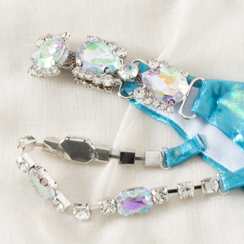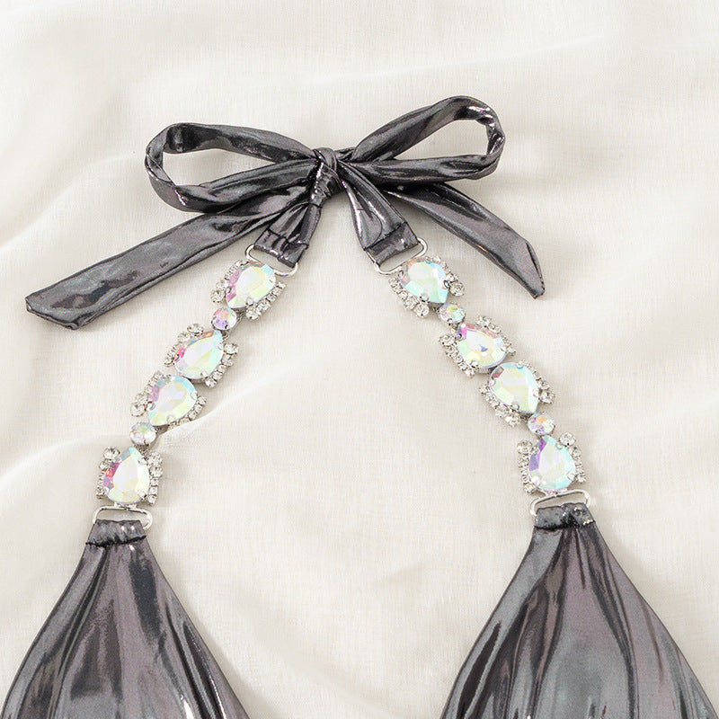 Make waves in this dazzling two-piece that’s dripping in glamour. The glossy, ocean-inspired finish catches the light like sea glass, while the rhinestone straps add a touch of mermaid magic. With luxe details and a barely-there silhouette, this bikini is made for bold sun goddesses who love to shine.